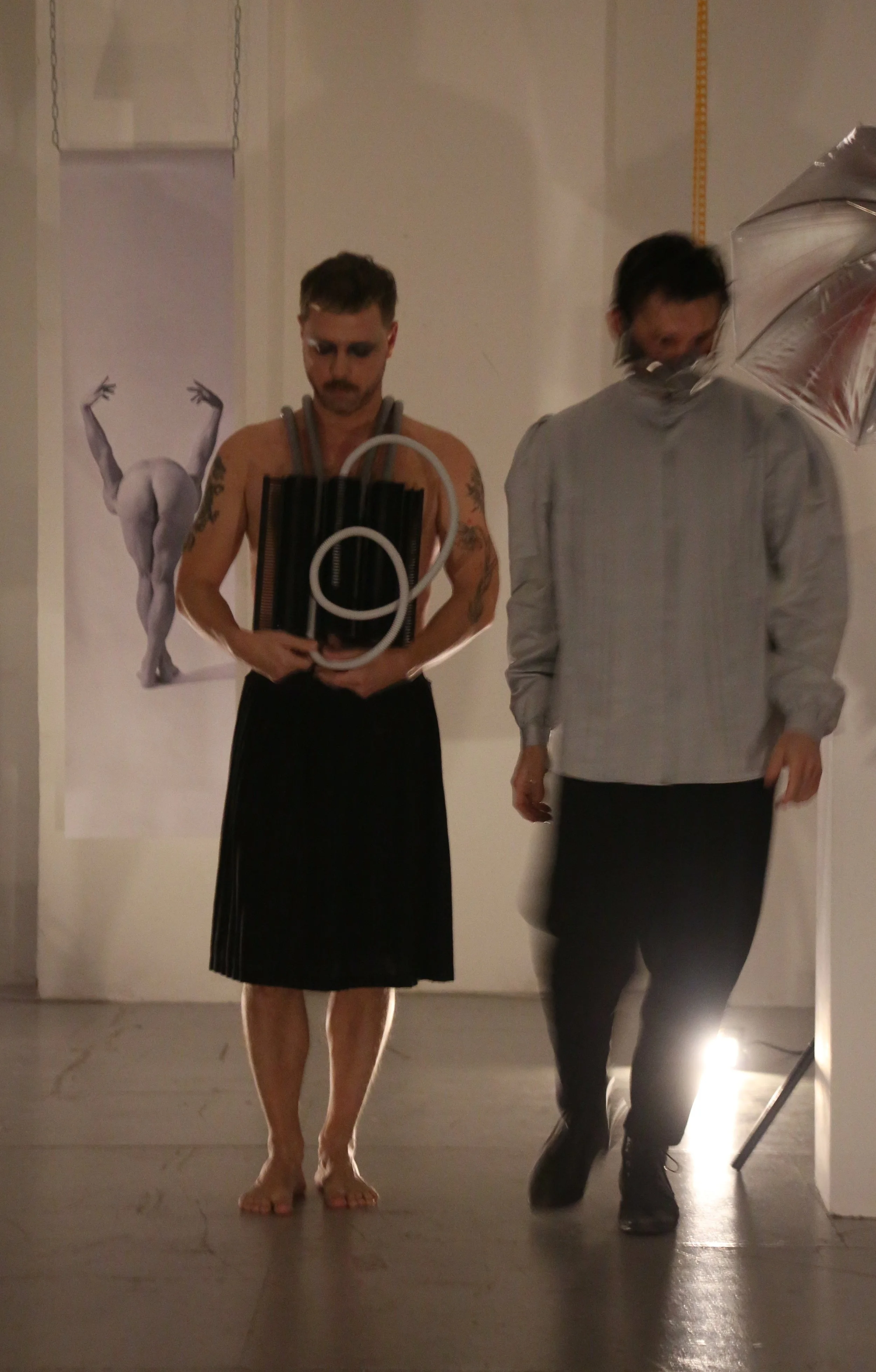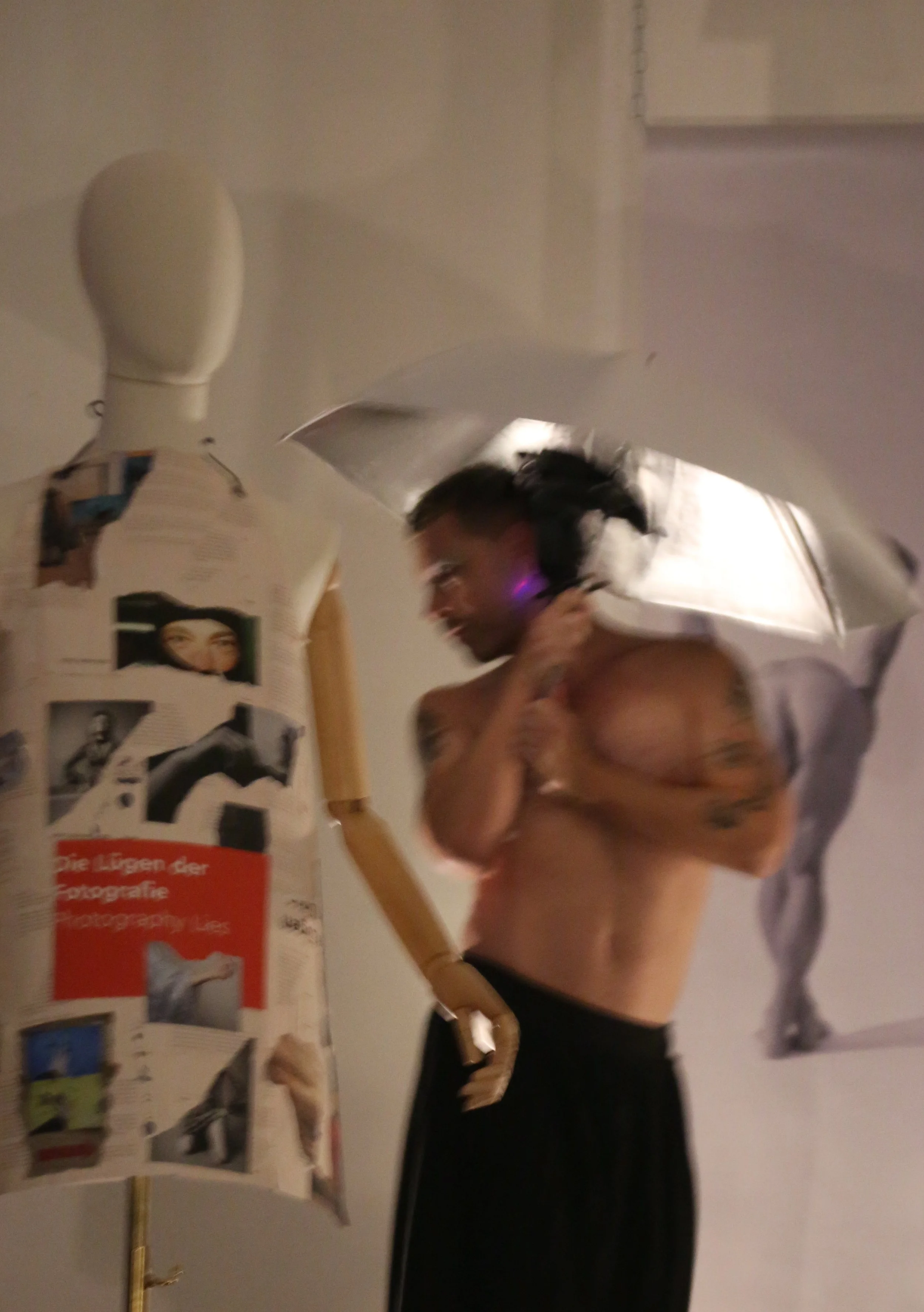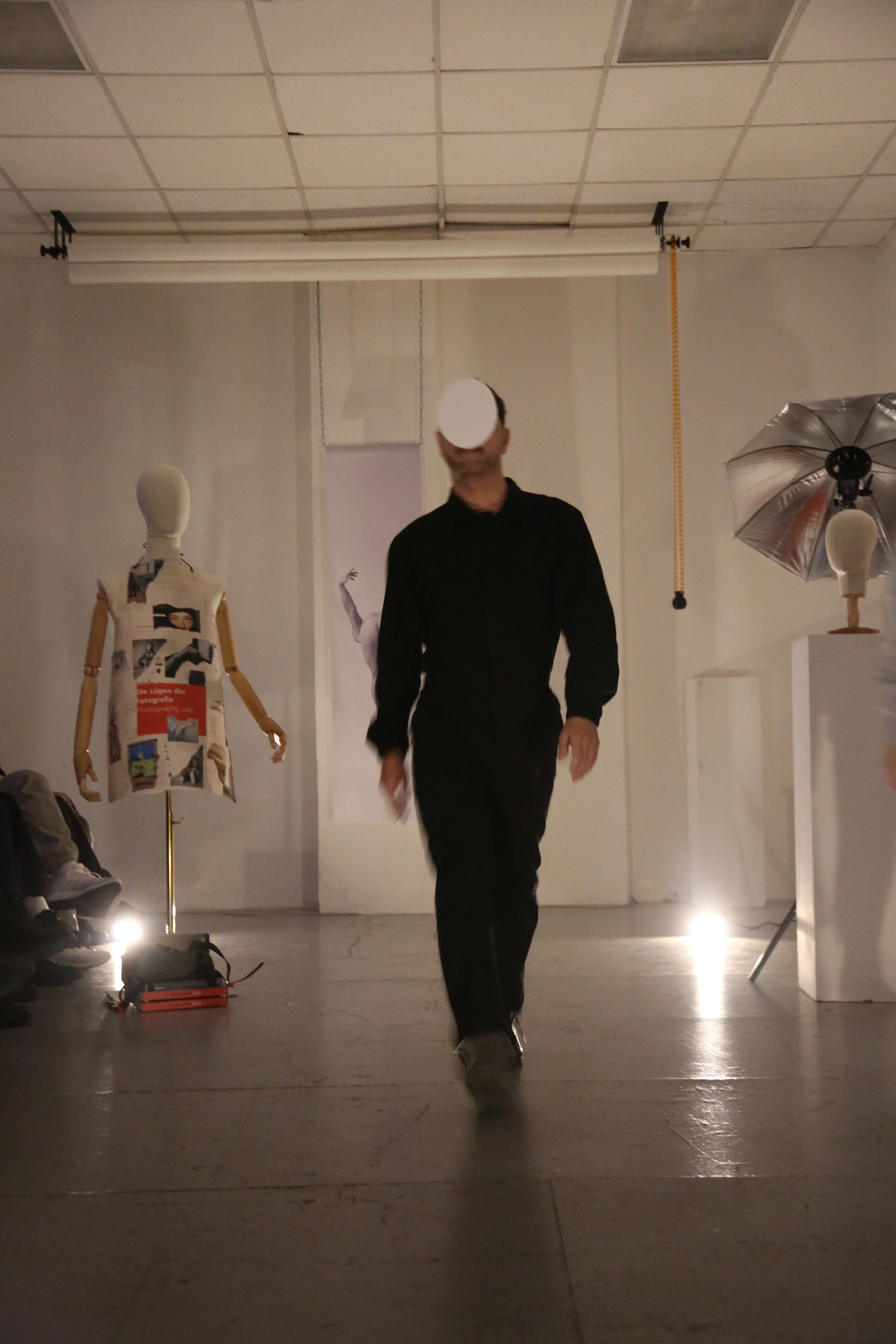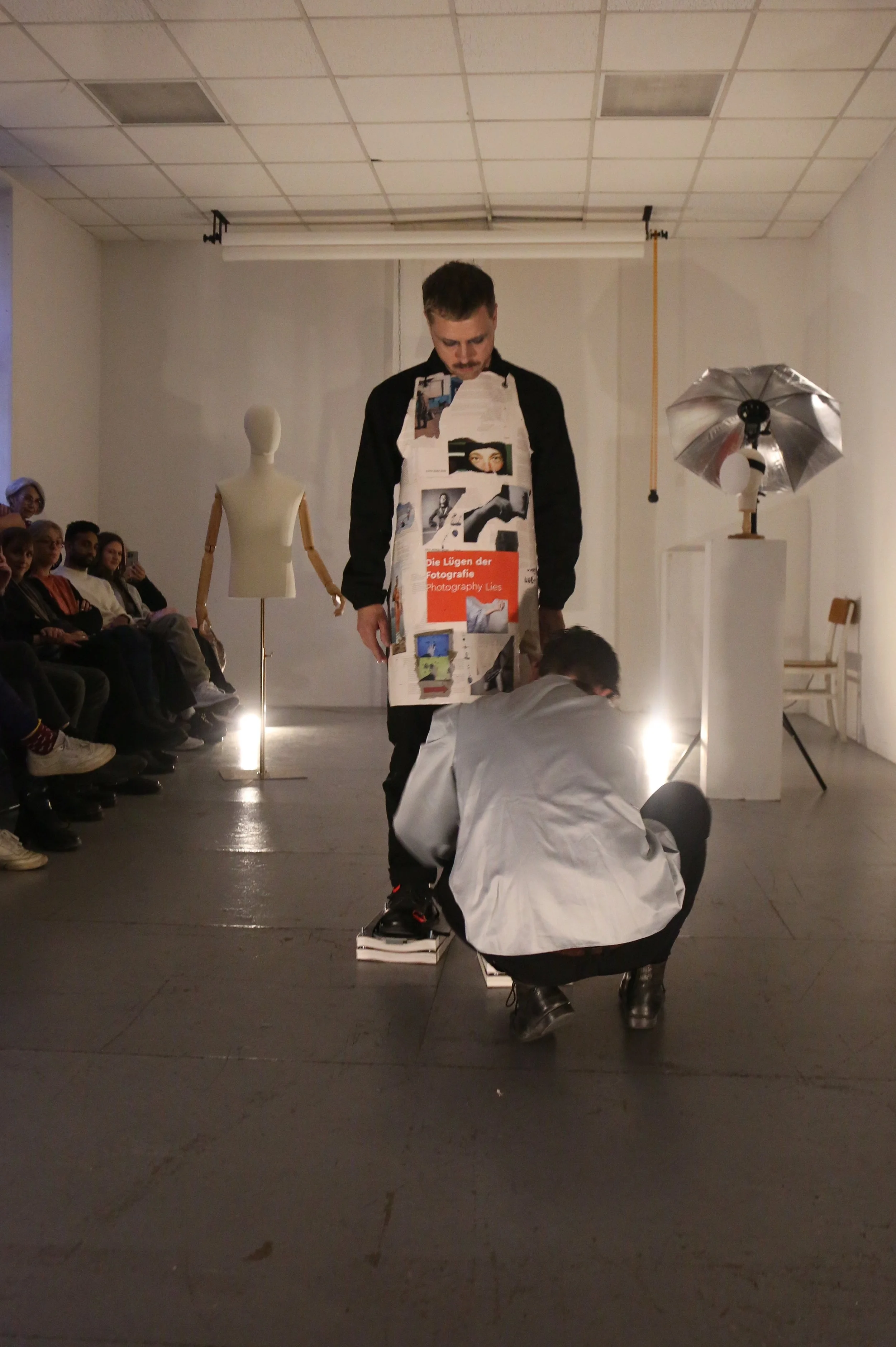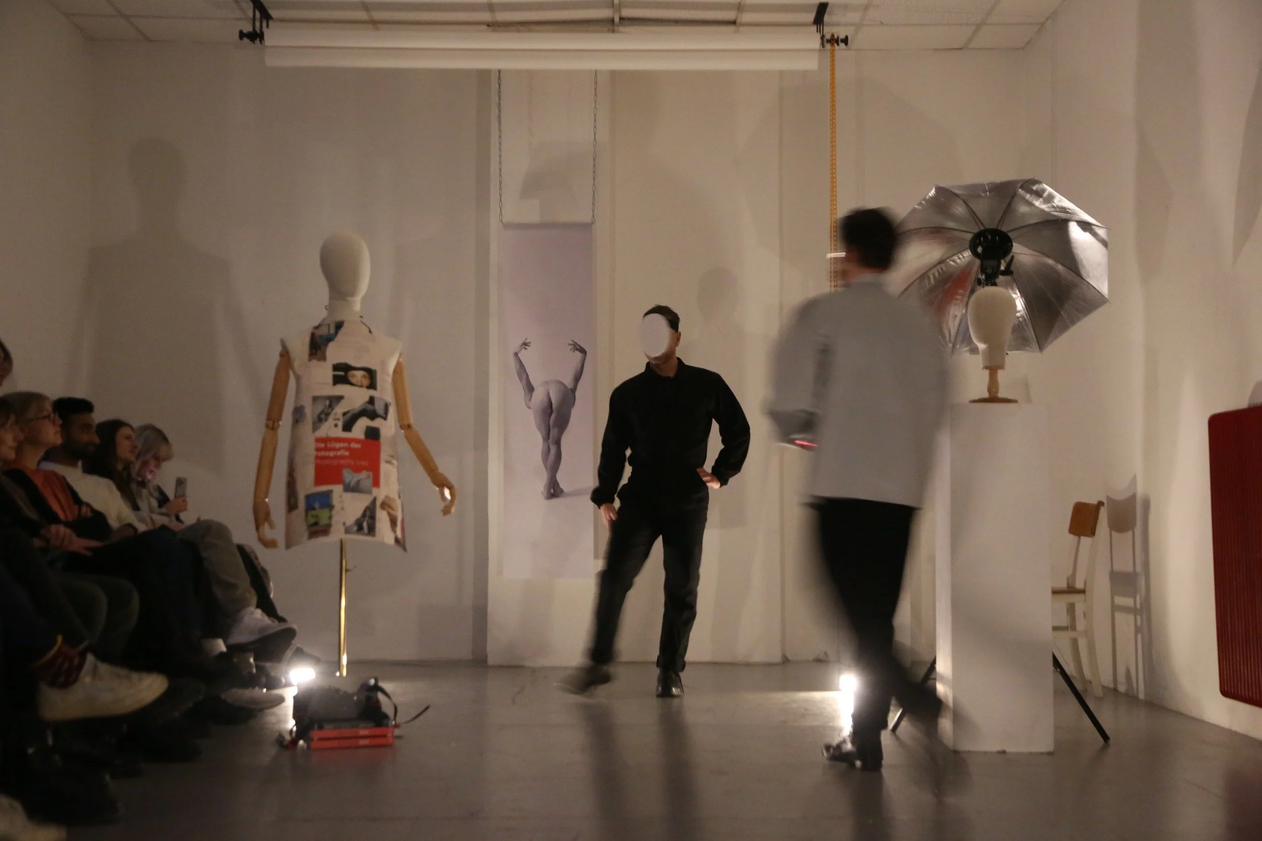 The first part of our finale was a kind of reimagined runway as a site of critique and transformation. Wearing a series of photographically charged objects, I moved through the space as if on a catwalk, queering the codes of fashion, beauty, photography and labor.