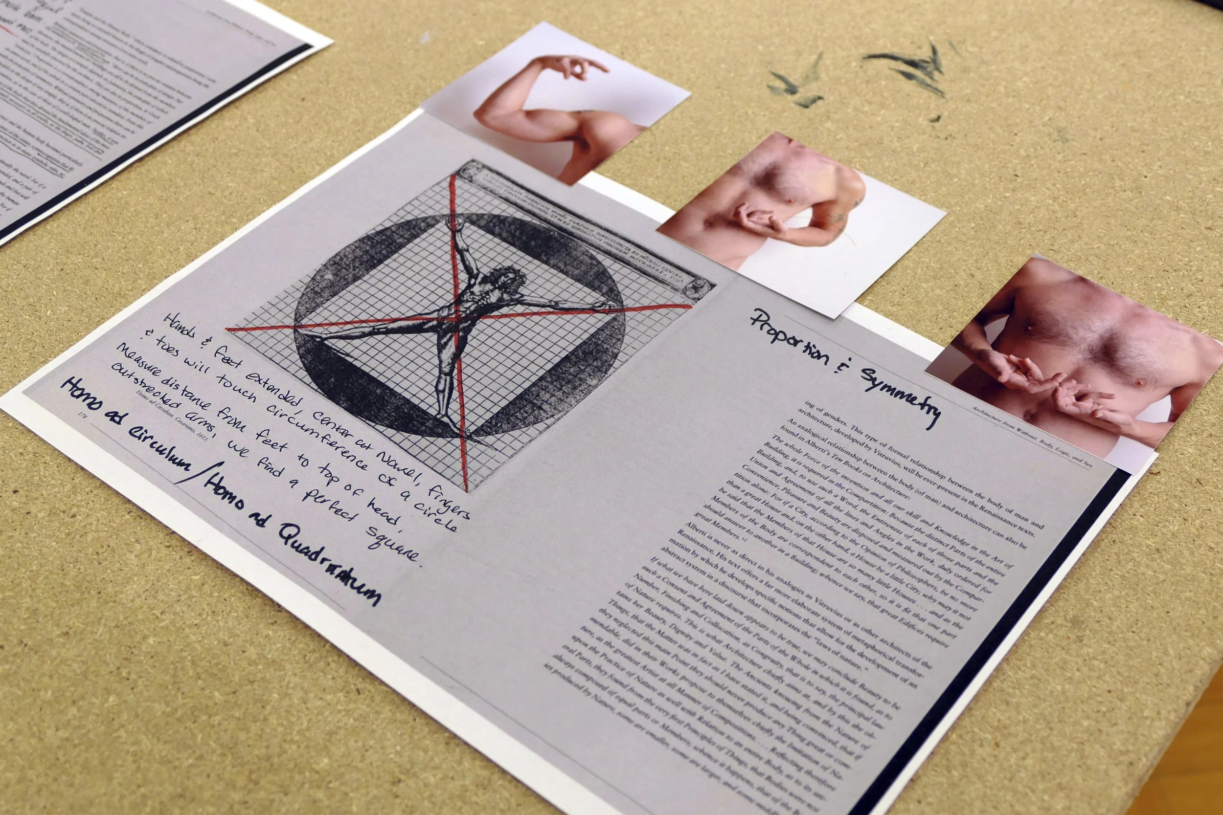 The intimate bodily fragments contrast the permanence of plaster with the ephemerality of the image, grounding historical ideals of form and proportion in lived, vulnerable flesh. Circles and grids etched into the plaster reference classical systems of measure while resisting their totalizing logic through asymmetry and sensual detail.